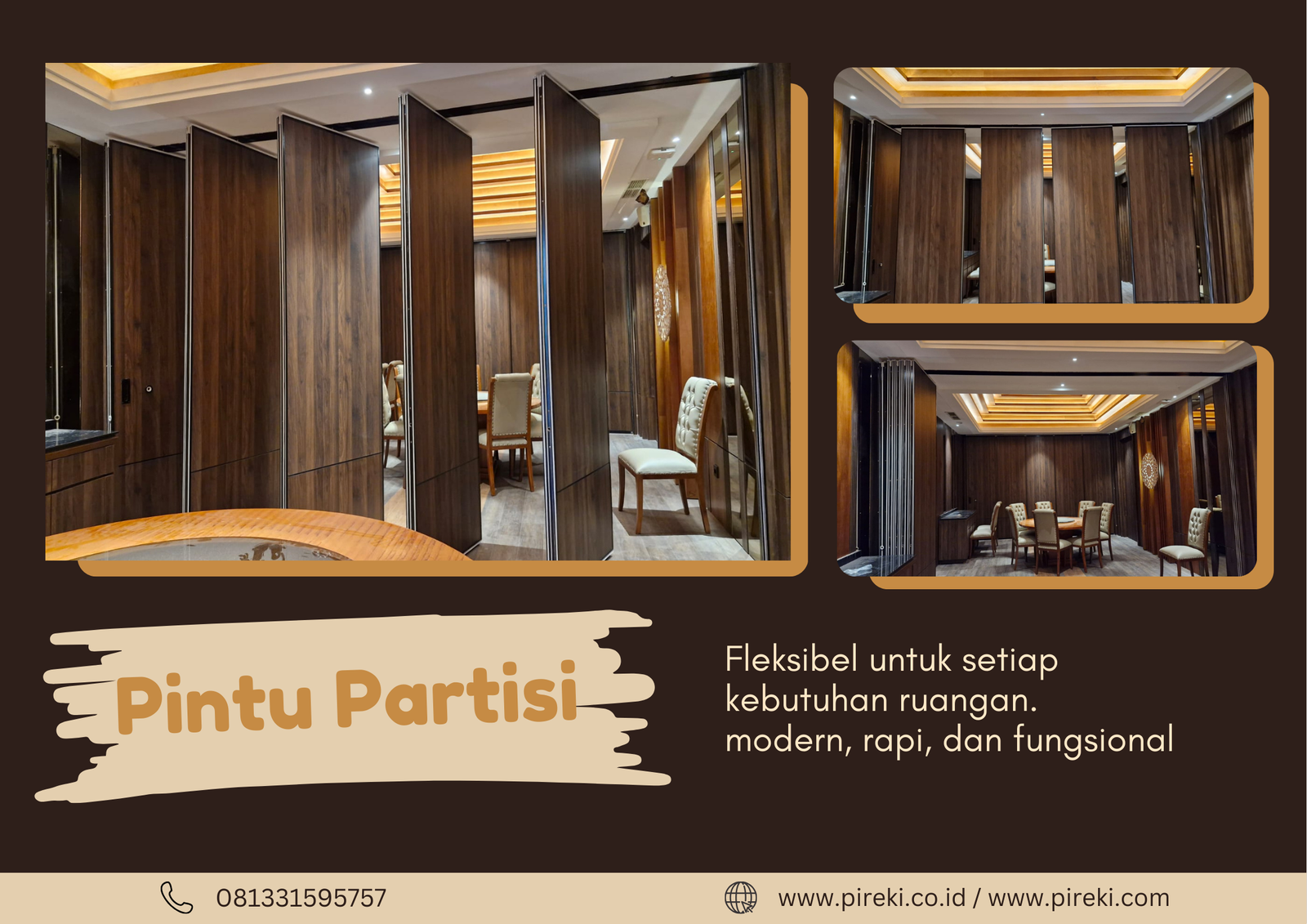 Dengan desain modern, fungsi fleksibel, dan kemudahan penggunaan, pintu partisi Pireki menjadi solusi efektif untuk pengaturan ruang. Oleh karena itu, produk ini membantu pengguna menciptakan ruang yang lebih efisien sekaligus tanpa mengurangi kenyamanan dan nilai estetika.